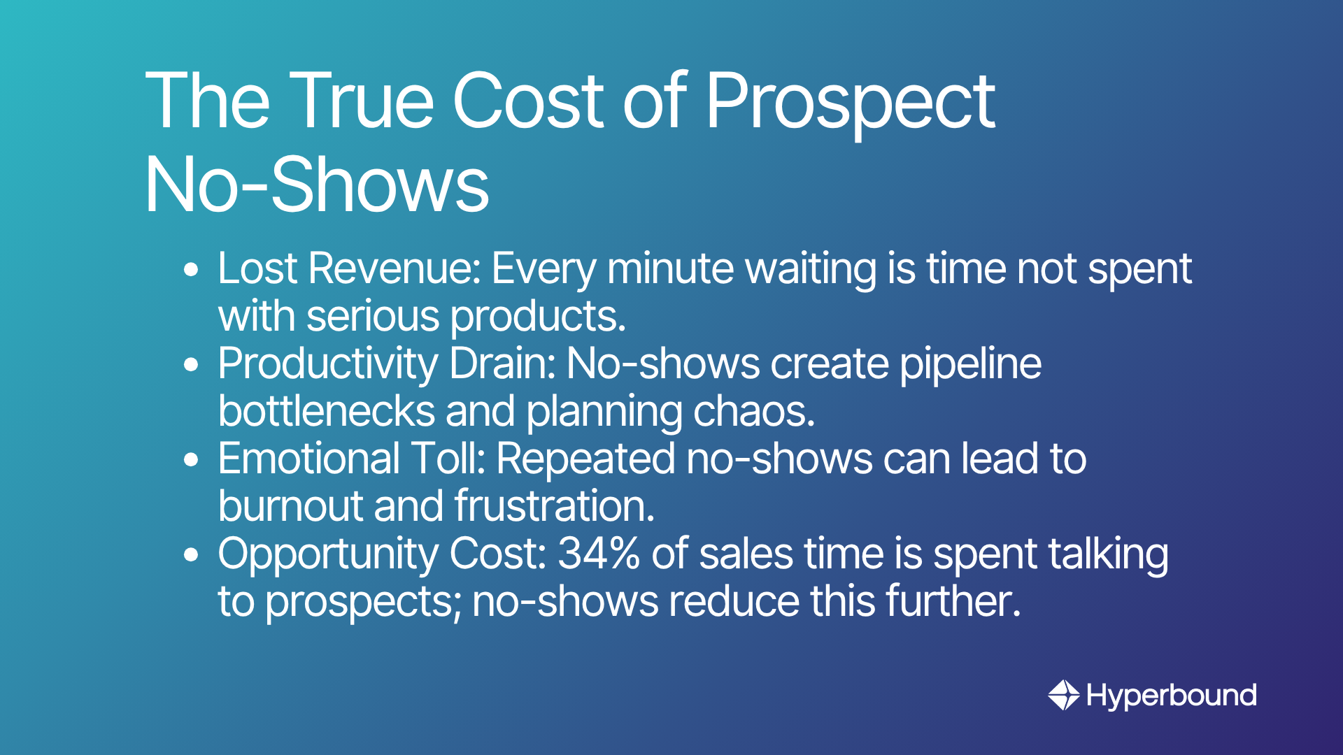- Lost Revenue Opportunities: Every minute spent waiting for a no-show is a minute not spent engaging with serious prospects. According to research, salespeople allocate only 34% of their time to actually talking with prospects. No-shows shrink this percentage further.