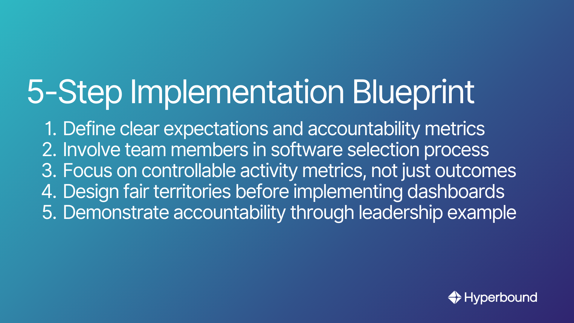 Successful implementation starts with clear communication and team involvement. First, define and articulate what accountability means for your team. Involve them in the software selection process to ensure buy-in. Focus on tracking controllable activities they can influence, and ensure your territory and goal distribution is fair. Finally, lead by example by demonstrating how leadership uses the tools for improvement.