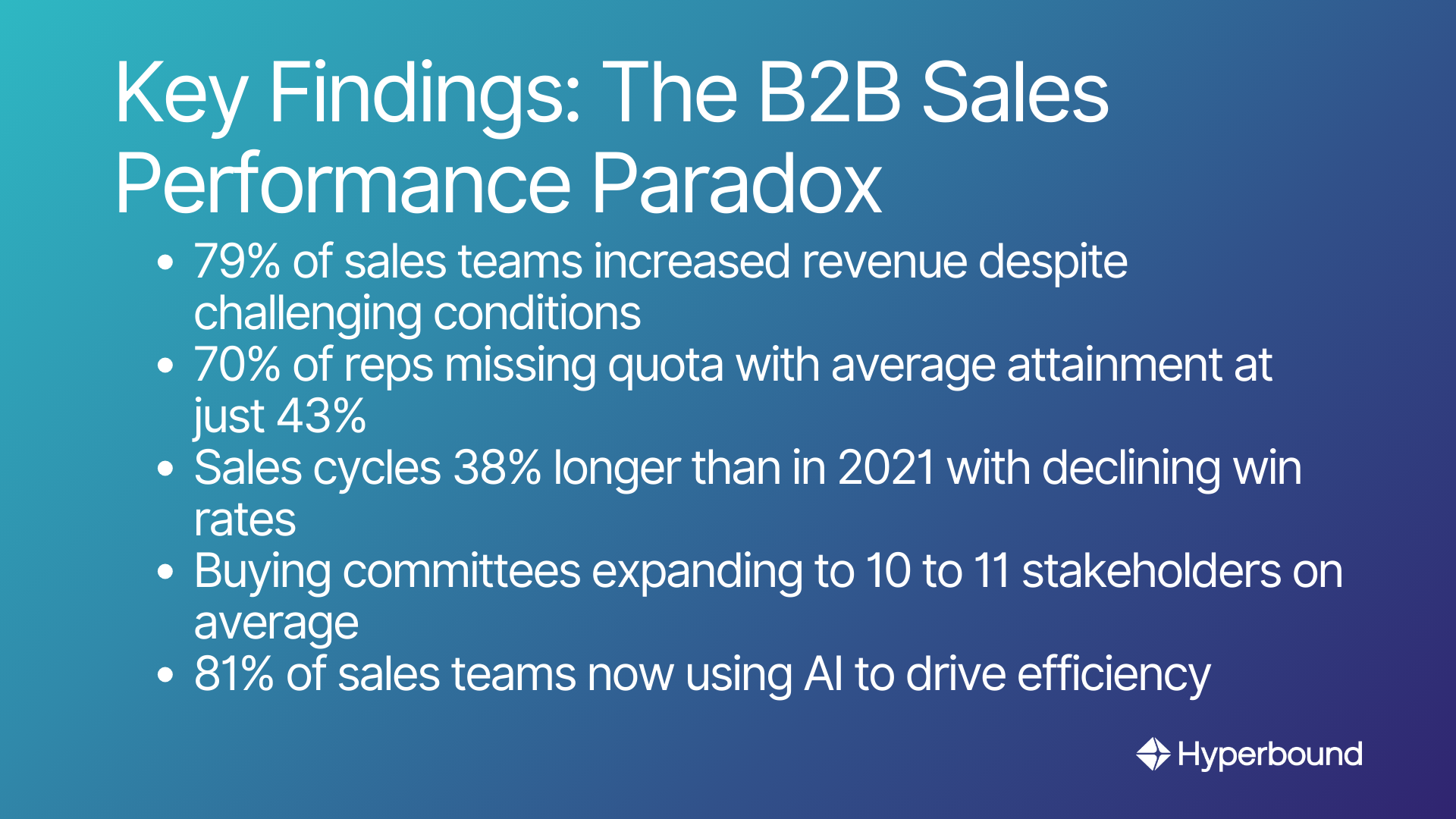 - B2B sales faces a "performance paradox": despite revenue growth, up to 70% of reps miss quota and average attainment is just 43%, driven by longer sales cycles and larger buying committees.