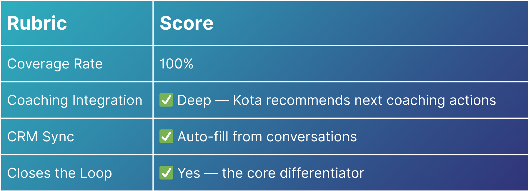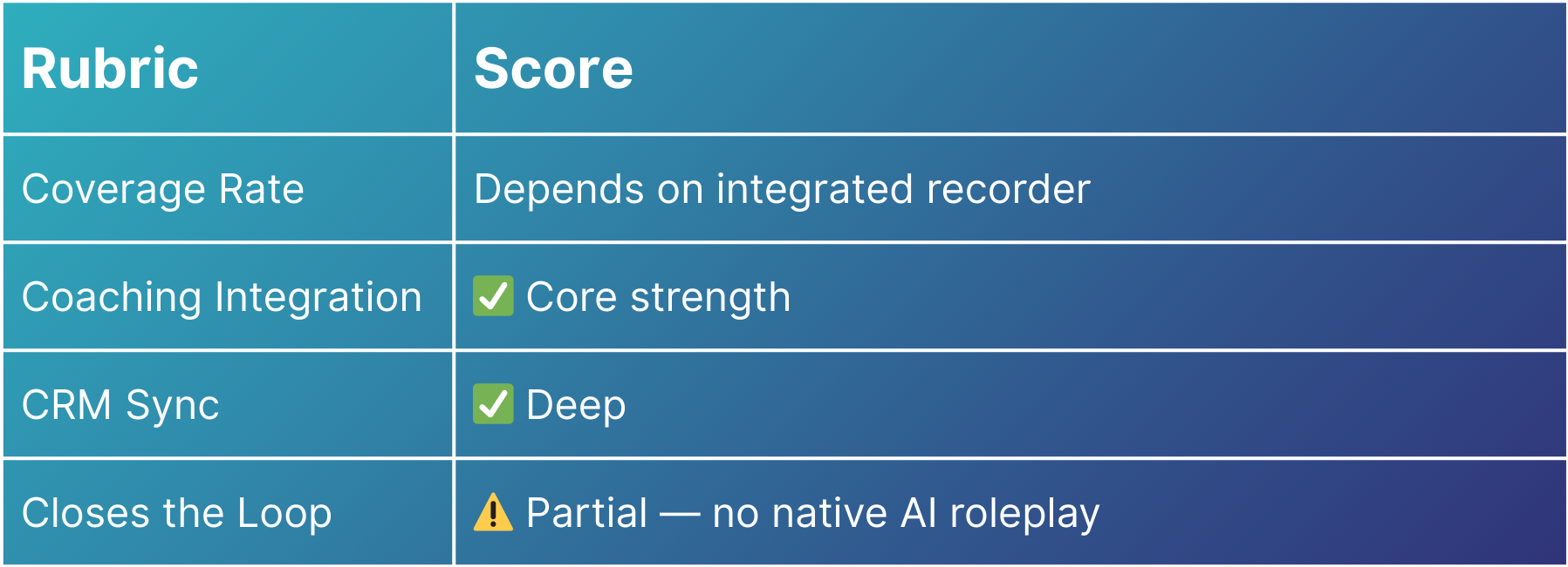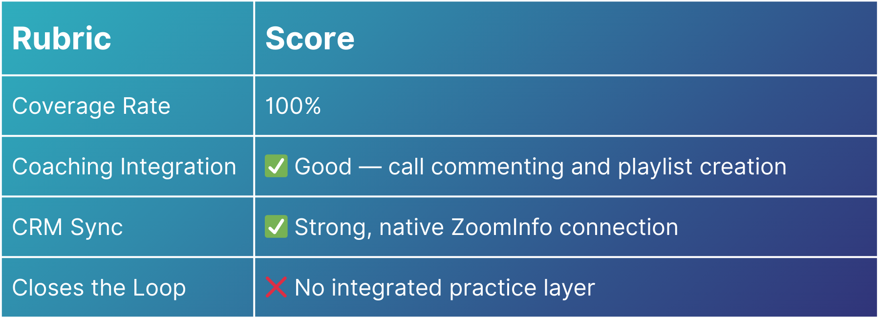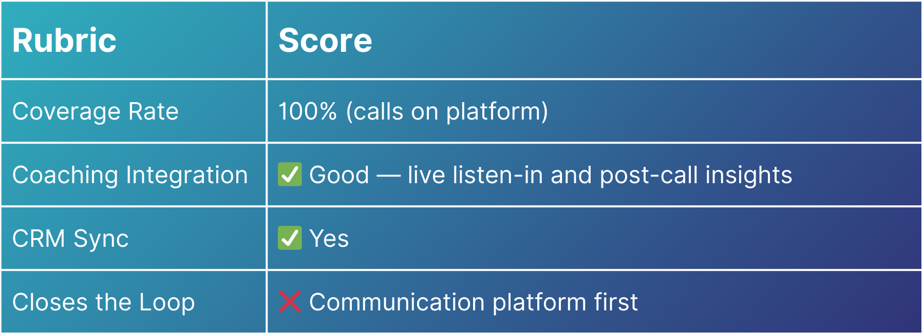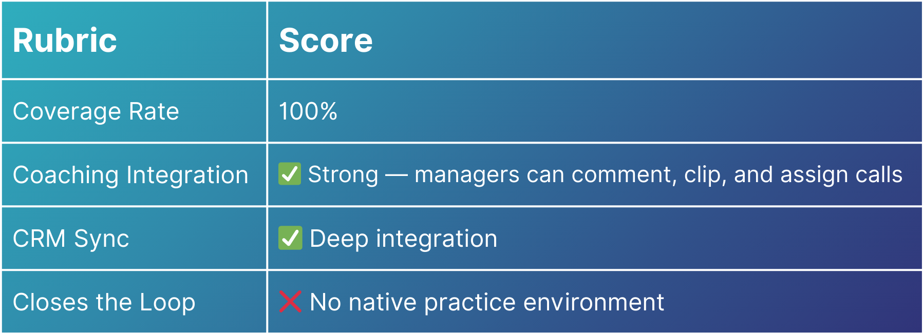 - Coaching Integration — How easily do insights flow into coaching workflows? Can a manager act directly from a flagged call?