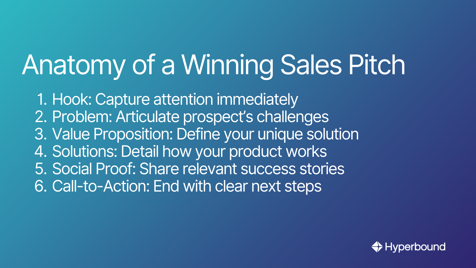 A winning sales pitch follows a clear structure: Hook, Problem, Value Proposition, Solutions, Social Proof, and a Call-to-Action. It begins by capturing attention (Hook), articulates the prospect's challenges (Problem), defines your unique solution (Value Proposition), details how it works (Solutions), provides evidence with success stories (Social Proof), and ends with a clear next step (Call-to-Action).