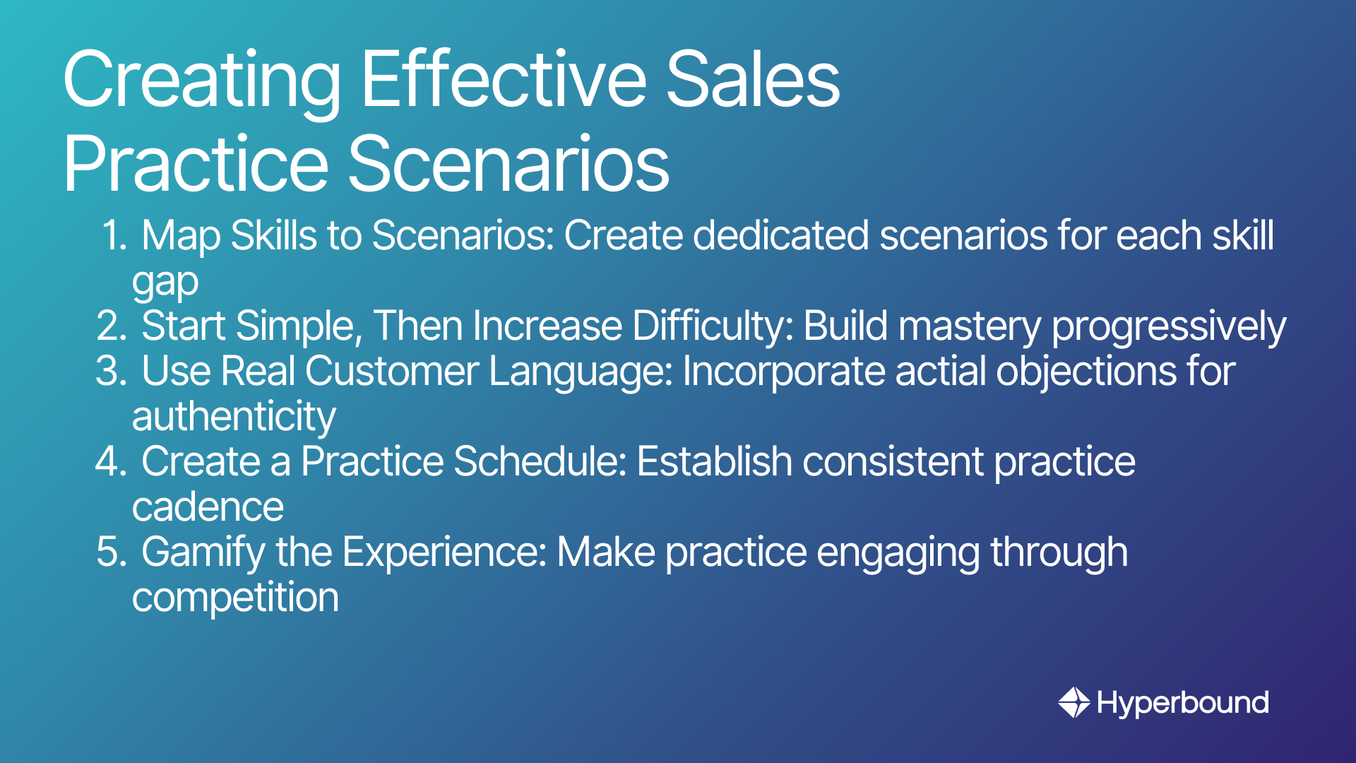 Hyperbound's AI Sales Roleplays allow managers to scale personalized practice across their entire team. Based on the winning behaviors and skill gaps identified in Step 1, you can create hyper-realistic AI simulations that provide: