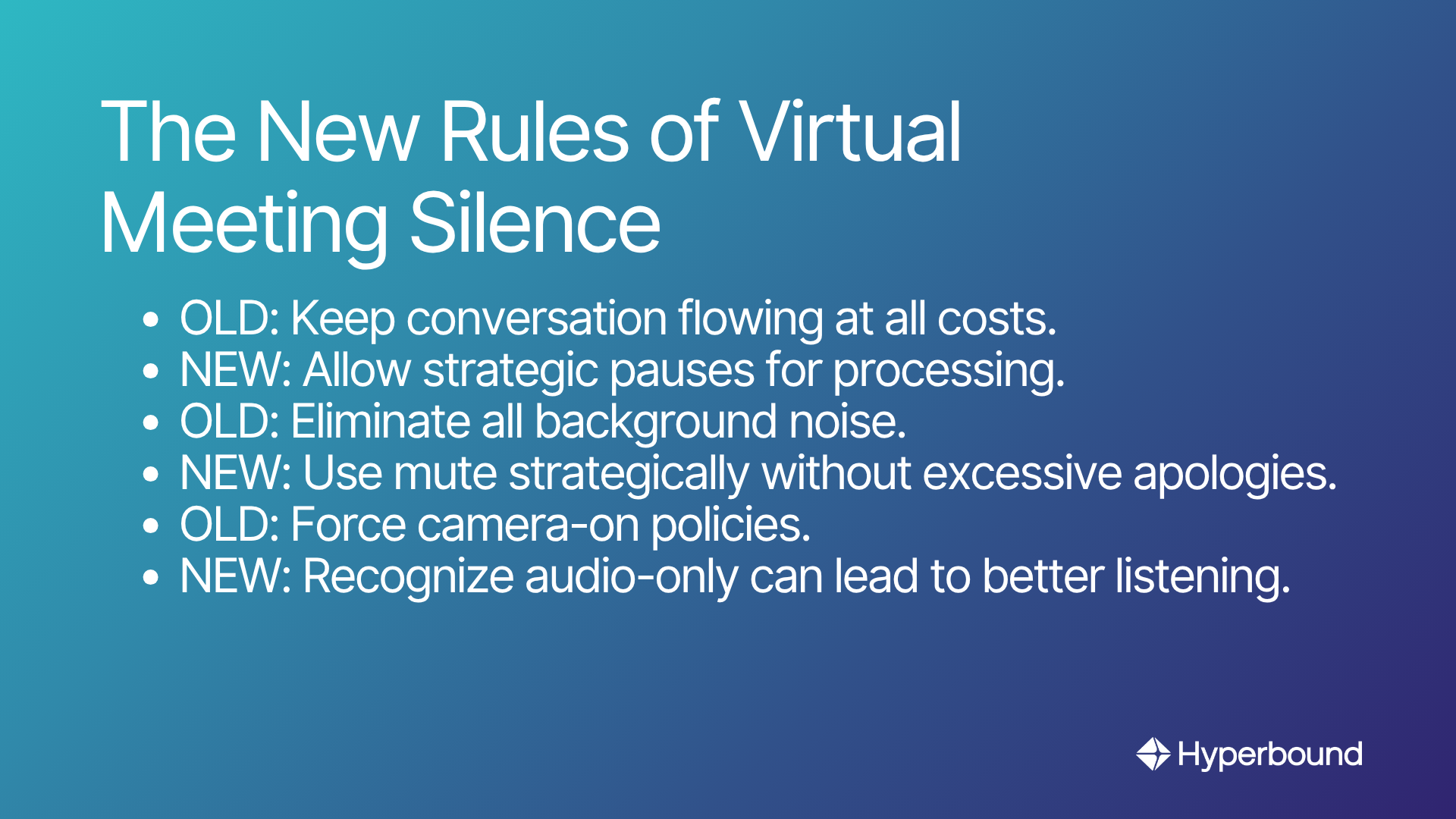 Old Rule: Force camera-on policies to ensure engagement. New Rule: Recognize that audio-only participation can sometimes lead to better listening and more thoughtful responses.