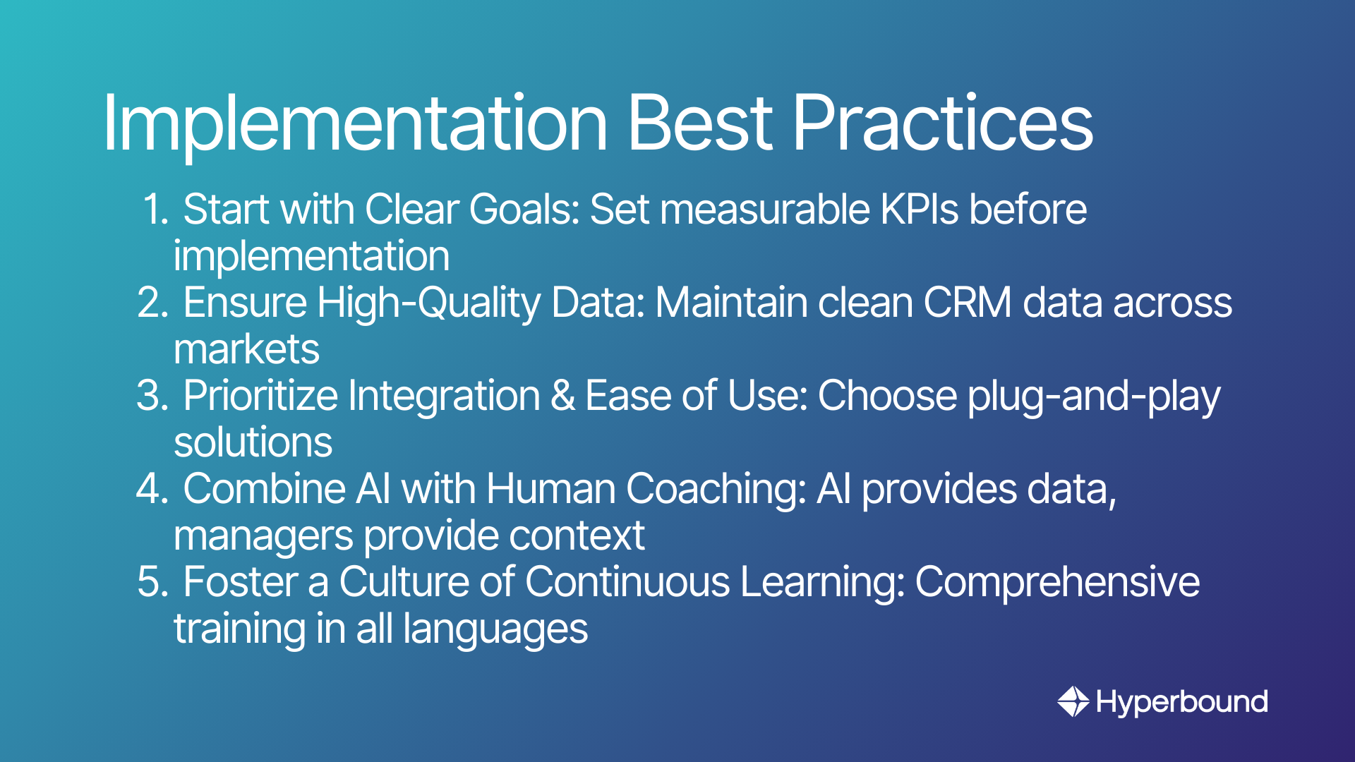 Set measurable KPIs before you start. Don't just adopt AI; have a purpose. Are you trying to reduce ramp time by 30%? Increase win rates by 15%? Improve customer retention across specific regions? Clearly defined goals will help you measure success and justify the investment.