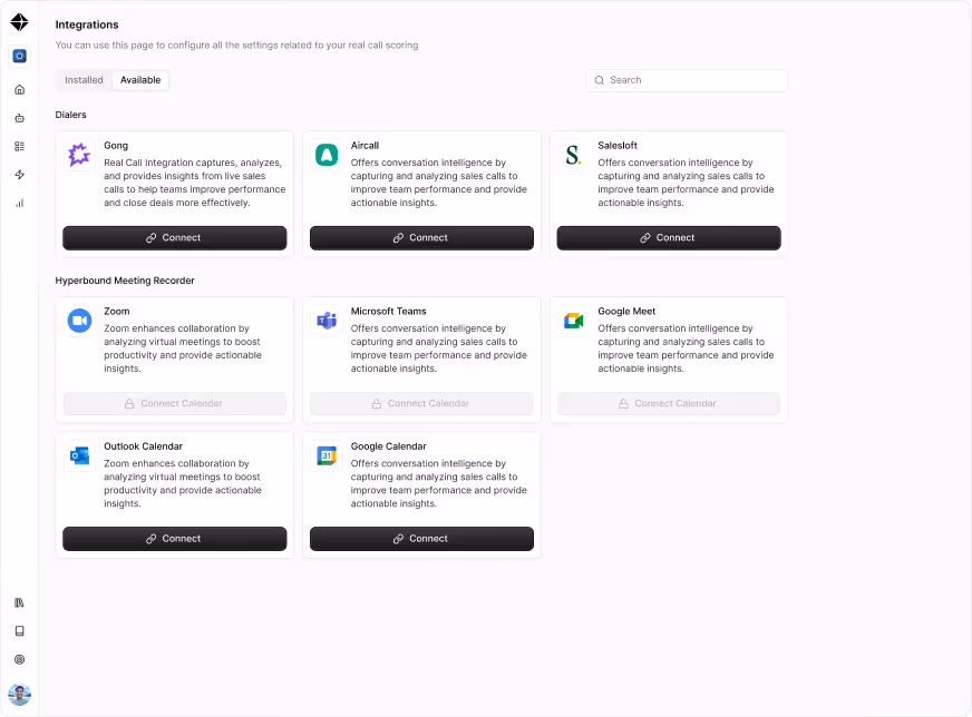 Hyperbound integrates with the tools RevOps teams already use including Salesforce, HubSpot, Gong, and Salesloft. Real call scoring runs automatically on recorded conversations with no workflow disruption.